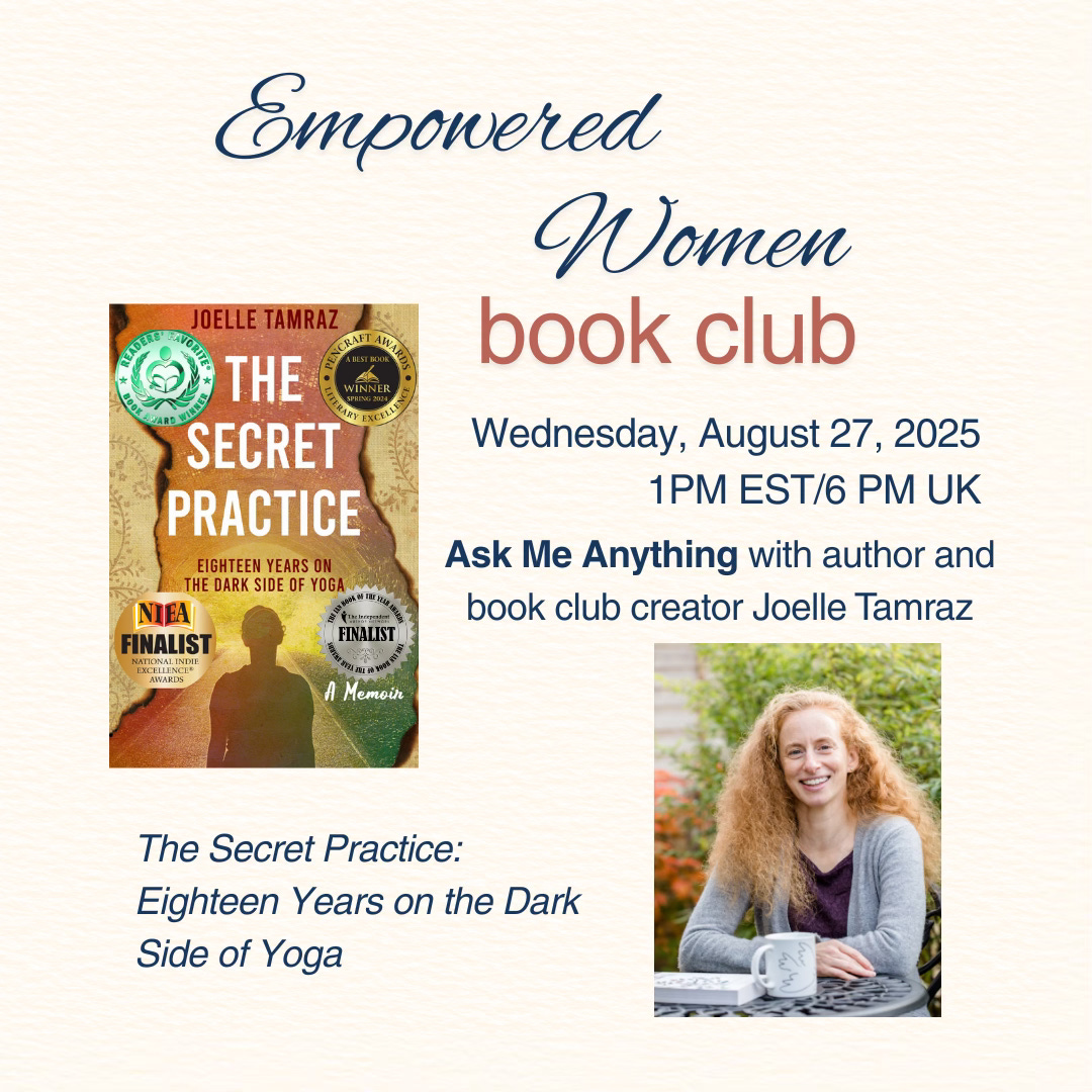 Next Wednesday, August 27, you’re warmly invited to an Ask Me Anything session with the Empowered Women Book Club in celebration of two years since my debut memoir, The Secret Practice: Eighteen Years on the Dark Side of Yoga, was published.